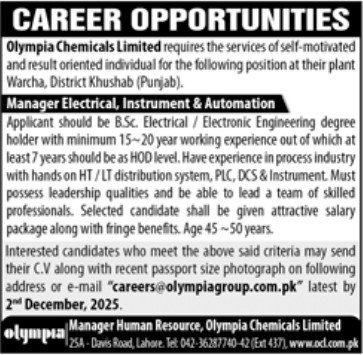 Both Male and Female candidates can apply for these Olympia Limited Jobs who have the Qualification: Applicant should have a B.Sc. Electrical/Electronic Engineering degree holder with a minimum of 15-20 years of working experience, out of which at least 7 years should be at the HOD level. Have experience in the process industry with hands-on HT/LT distribution system, PLC, DCS & instrumentation. Must possess leadership qualities and be able to lead a team of skilled professionals. The selected candidate shall be given an attractive salary package along with fringe benefits. Age 45-50 years, and many more experienced candidates should apply before 02 December 2025.