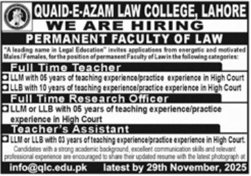 Vacancies Details Of Quaid e Azam Law College Lahore Jobs 2025